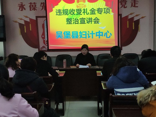 2月26日下午,吴堡县妇幼保健计划生育服务中心组织全体职工召开了违规收受礼金专项整治宣讲会,会议由妇计中心主任王文琴主持。